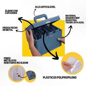 - Plásticos já inclusos rebitados no álbum com pinos metálicos (não é possível inserir mais folhas)