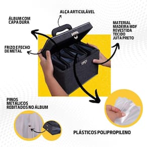 - Plásticos já inclusos rebitados no álbum com pinos metálicos (não é possível inserir mais folhas)