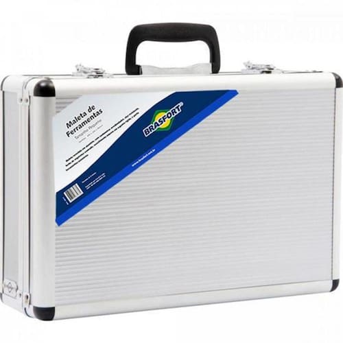 Acomodar ferramentas e objetos de uso geral; Corpo com estrutura em papelão prensado, envolvido por material protetor em PVC na cor cinza com alça PVC na cor preta, cantoneiras e detalhes em aço carbono cromado e forração em PVC cinza.Dimensões:395 X 240 X 90mm CxLxA