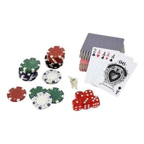 O kit conta com 500 fichas, que são essenciais para a realização das apostas durante as partidas. Além disso, acompanham o kit 2 jogos de baralho e 5 dados, que complementam a experiência do jogo.