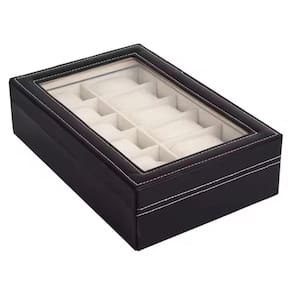 Maleta Porta Relógio Unissex para 12 Peças com Estojo para Anéis Joias e Brincos em Madeira MDF e Couro com Visor