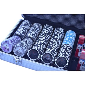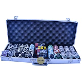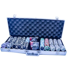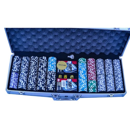 O kit é composto por um total de 500 fichas de poker de peso profissional, acondicionadas em uma maleta de alumínio com revestimento interno em espuma de alta densidade para proteção e organização.