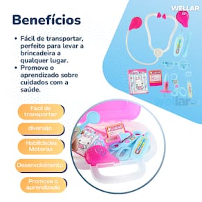 Uma maleta encantadora e cheia de acessórios para crianças que amam brincar de médico. Com design divertido, o kit inclui todos os acessórios necessários para ser um médico, como estetoscópio, termômetro, seringa e muitos outros acessórios coloridos. Conta também com maleta de alça para poder carregar sem dificuldades, levando a brincadeira para todos os lugares. Este kit estimula a imaginação e ensina sobre cuidados com a saúde, sendo ideal para desenvolver diversas habilidades.