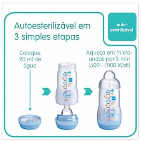 A Mamadeira Easy Start da MAM é desmontável e auto esterilizável em 3 minutos. Compatível com diferentes tamanhos de bicos MAM