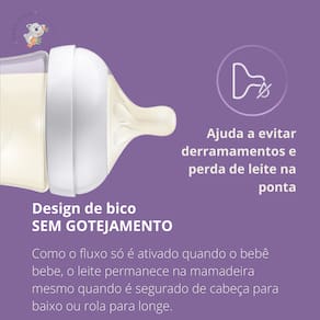 O Bico de Resposta Natural ajuda a prevenir derramamentos e perda de leite na ponta. Como o fluxo só é ativado quando o bebê bebe, o leite permanece na mamadeira mesmo quando é segurado de cabeça para baixo ou rola para longe.