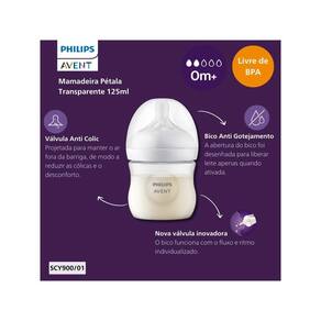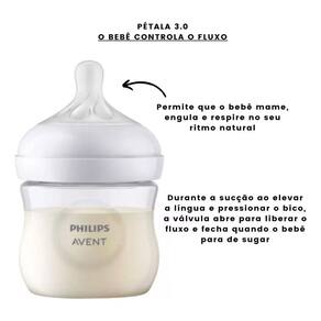 O bico com formato largo é feito de silicone e o copo em polipropileno, fácil de limpar, com uma montagem rápida e prática, combina amamentação natural com a mamadeira. As pétalas no bico aumentam a flexibilidade e promovem a pega correta, para que o bebê possa abocanhá-lo como se fosse o seio, facilitando a o ritmo da amamentação.