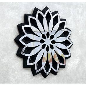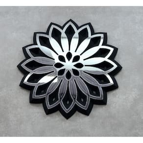 Características Medidas: Espessura: 4 cm Altura: 65 cm Largura: 65 cm Composição: MDF e Espelho acrílico prata Cor: Preto e prata Fixação: acompanha pendurador garrinha que permite a regulagem da mandala.