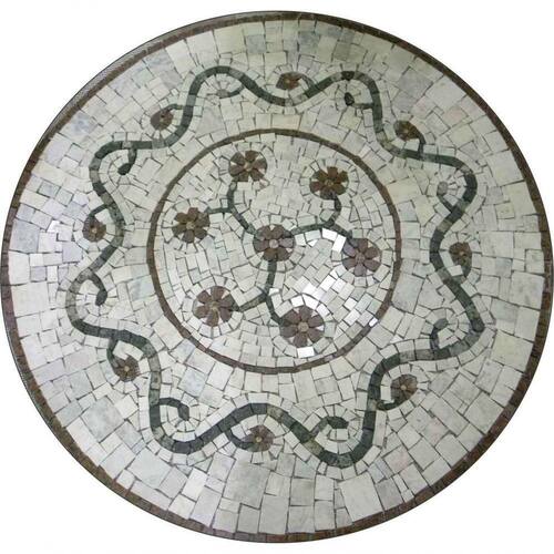 O Rosone Floral é um clássico de origem no Mosaico Romano. Há mais de 10 anos, ele tem sido um dos modelos mais pedidos em nosso ateliê, devido à sua estilização elegante da margarida, composta por 6 tesselas de pedra branca.