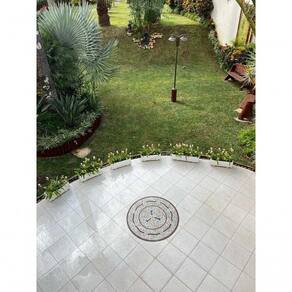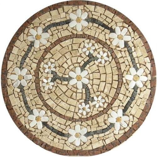 O Rosone Floral é um clássico de origem no Mosaico Romano. Há mais de 10 anos, ele tem sido um dos modelos mais pedidos em nosso ateliê, devido à sua estilização elegante da margarida, composta por 6 tesselas de pedra branca.