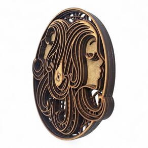 Enfeite decorativo em MDF com o tema de Mandala do signo de Gêmeos. Esse tipo de item costuma ser utilizado para decoração de interiores, especialmente em espaços como quartos, salas de meditação, escritórios ou até como presente temático.