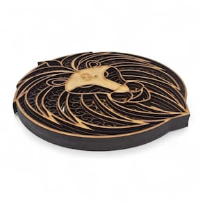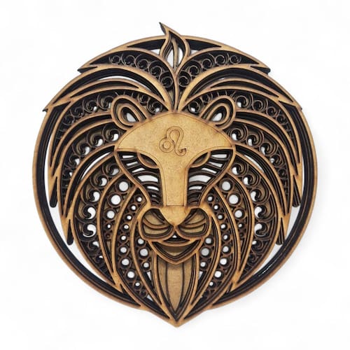 Características gerais: Material: MDF Tamanho: 17 cm de diâmetro Estilo: Mandala com símbolos do signo de Leão (geralmente com Leão estilizados, o símbolo ou temas astrológicos) Uso: Decoração de parede, prateleiras, mesas ou até mesmo como parte de um altar ou cantinho espiritual