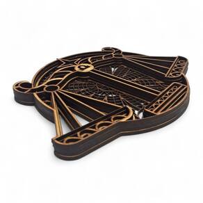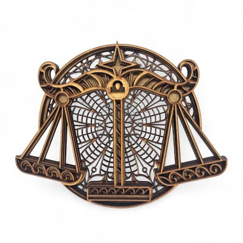 Características gerais: Material: MDF Tamanho: 17 cm de diâmetro Estilo: Mandala com símbolos do signo de libra (geralmente com libra estilizados, o símbolo ou temas astrológicos) Uso: Decoração de parede, prateleiras, mesas ou até mesmo como parte de um altar ou cantinho espiritual