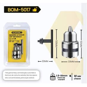 Mandril 3/8 Com Chave Para Trabalho Seguro e Estável O Mandril com Chave 1/2 20F. Fosca Bom-5017 é a ferramenta ideal para quem busca precisão e eficiência em perfurações. Com um design ergonômico, proporciona conforto durante o uso, permitindo um ajuste e aperto seguros. Suas três garras fixas garantem uma perfuração estável, essencial para trabalhos que exigem alta qualidade. Este mandril é compatível com chaves de mandril que variam de 1.5 a 13 mm, oferecendo versatilidade para diferentes tamanhos de brocas. A chave de 10 mm facilita o manuseio e a troca de ferramentas, tornando-o um item indispensável para profissionais e entusiastas Marca: Não Informado