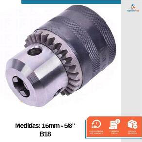 CARACTERÍSTICAS TÉCNICAS: Material: Aço Medidas: 16mm - 5/8 abertura Diâmetro do corpo: 50mm Capacidade mínima: 3mm Capacidade máxima: 16mm Tipo de mandril: Com chave Tipo de encaixe do mandril: Cone Medida do cone/rosca: Cone B 18 Acompanha chave para mandril Marca: Starfer Ref.: 9121031