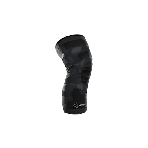 Apresenta um design híbrido exclusivo Combina as propriedades de compressão e reforço Três zonas de compressão distintas A faixa de silicone posicionada anatomicamente ajuda a aliviar a carga patelofemoral Durável e leve