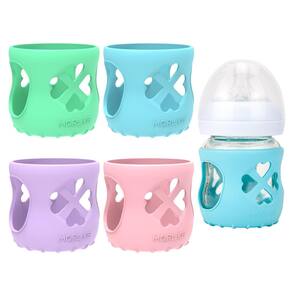 Mangas para mamadeiras de vidro de silicone MORLIKE — Suporte para mamadeiras Conteúdo da embalagem: 4 capas para mamadeiras de vidro de silicone Material: 100% material de silicone de qualidade alimentar, livre de BPA, grafite e ftalatos, não tóxico, inodoro e sem desbotamento Característica: silicone macio e flexível para facilitar a remoção. O material ultrafespesso oferece proteção poderosa. Ferva, pode ser lavado na geladeira e na máquina de lavar louça (somente na prateleira superior) Diferentes cores elegantes para distinguir facilmente a textura elevada na parte inferior para minimizar o ruído e evitar escorregões. Observe a linha de leite os recortes: cores vibrantes e design de pétalas atraem o bebê A manga facilmente esvaziada seca rapidamente após a lavagem Aviso: Limpe antes e depois do uso Verifique se há danos antes de usar - Material de segurança - Essas capas de silicone Morlike servem somente para mamadeiras de vidro SCY910 da Philips AVENT. Feito de material de silicone de qualidade alimentar, que é livre de BPA, inodoro e não tóxico. É macio e não tem bordas afiadas. O material durável não racha nem rasga facilmente, você pode usá-lo com confiança. - Oferece proteção extra - Essas capas de silicone para mamadeiras são acessórios indispensáveis para mamadeiras, com um bom efeito de amortecimento, para que você não precise mais se preocupar com a quebra se a mamadeira cair acidentalmente. Além disso, é super elástico, facilitando a colocação e a retirada. - Design oco - Nossas capas de silicone para mamadeiras são projetadas com várias janelas, permitindo que os pais visualizem a escala de medidas ao alimentar seu filho ou preparar leite em pó. Além disso, essas cavidades promovem o fluxo de ar para secagem rápida após a lavagem. - Fácil de limpar - Esses porta-mamadeiras de silicone são resistentes ao calor e podem ser lavados na máquina de lavar louça sem nenhum problema. Ele fornece uma proteção extra para sua mamadeira contra choques durante a limpeza. Tudo o que você precisa fazer é colocá-lo na prateleira superior e liberar suas mãos. Ele pode ser reaproveitado várias vezes. - Mais tranquilidade - Conjunto de 4 capas de mamadeira em cores diferentes, incluindo roxo, azul, rosa e menta. O design do padrão de coração adiciona uma sensação fofa e divertida ao bebê. As cores vivas são fáceis de atrair a atenção do bebê durante a alimentação. Quando a garrafa é colocada sobre a mesa, a textura elevada na parte inferior a torna mais estável e reduz o ruído.