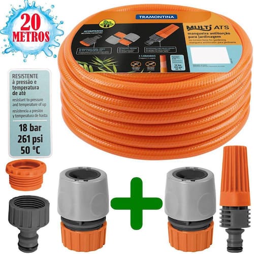 Mangueira ATS Anti-torção 1/2 Tramontina 20 Metros Completa Otimize suas tarefas de jardinagem com a mangueira antitorção Multi ATS 1/2 Tramontina laranja em PVC 3 camadas 20 mEla é uma mangueira de uso fácil, prático e adequado para diversos tipos de atividades, devido ao seu revestimento de 3 camadas, que a torna altamente resistente.Tem extensão de 20 metros, alta flexibilidade e vai auxiliar você a irrigar sua horta ou seu jardim com fluxo constante de água, pois ela não torce e nem dobra.Com a Tramontina, você tem os melhores itens para executar suas tarefas Caracteristicas: SKU: 12479248203 - Mangueira com alta flexibilidade e fácil manuseio.- Não torce e não dobra- permitindo fluxo de água constante.- Possui 20 metros de comprimento.- Recomendada para situações de uso com pressão da água de até 14 bar 203 psi e temperatura de 50ºC.- Para maior resistência possui 3 camadas distintas: interna em PVC, intermediária em fio de poliéster trançado e externa em PVC.- Acompanha 01 esguicho com jato regulável, 02 engates rápidos e 01 adaptador fêmea com rosca de 3/4 e redução de 1/2.- O esguicho possui prático sistema de regulagem do fluxo d'água através do regulador frontal.- O esguicho é conectado em mangueiras de 1/2, 5/8 e 3/4 através de sistema de engate rápido. Itens Inclusos: 01 Mangueira ATS 20 Metros01 Adaptador Fêmea 3/4 e Redução 1/202 Engates Rápidos 1/201 Esguicho Com Jato regulavel