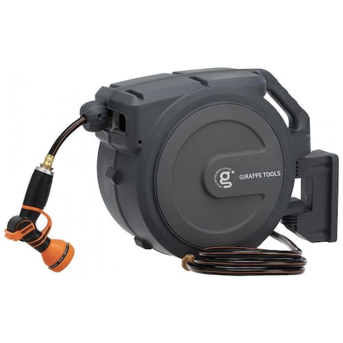 O carretel de mangueira Girafa é pré instalado com uma mangueira híbrida de 23,77 metros, que pode travar em qualquer comprimento desejado, cobrindo todos os cantos do seu jardim.