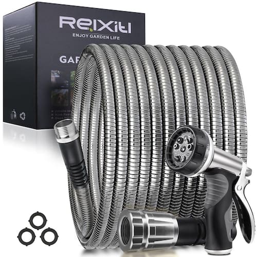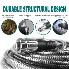 A mangueira de jardim de aço inoxidável Relxitl possui um exterior de aço inoxidável 304 e tubo interno de PVC espesso, tornando-a resistente à corrosão e durável para uso prolongado. Seu design leve e flexível evita embaraço, permitindo que ele passe facilmente por obstáculos. O conector de alumínio atualizado é resistente e à prova de vazamentos, e o bocal oferece 10 padrões de pulverização para atender às necessidades de irrigação e limpeza. Fácil de armazenar após o uso, economizando esforço e espaço. - Material de alta qualidade: a mangueira de jardim Relxitl é feita de aço inoxidável 304 de grau comercial com um tubo interno de PVC espesso, é mais resistente do que as mangueiras de água padrão, resistente à corrosão, à prova de ferrugem e construída para uso duradouro. - Leve e sem emaranhados: esta mangueira de jardim leve e flexível é fácil de manobrar, permitindo que ela passe suavemente através de árvores, superfícies pavimentadas e cantos sem dobras ou emaranhados, tornando-a mais fácil de usar. - Conector atualizado: equipado com um conector de alumínio estendido, oferece um ajuste seguro e resistente a vazamentos e maior durabilidade. O aço inoxidável e o design flexível proporcionam uma vida útil mais longa e liberdade para movê-lo em qualquer direção. - Bocal multifuncional: inclui um bocal com 10 padrões de pulverização e uma alça de borracha ergonômica antiderrapante, permitindo fácil controle do fluxo de água, tornando-o uma ferramenta de jardinagem eficiente. - Armazenamento conveniente: esta mangueira de jardim de metal é fácil de enrolar e armazenar e conveniente de transportar. Após o uso, drene a água da mangueira para um próximo uso mais fácil.