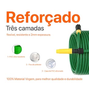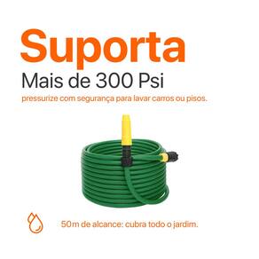 Confira os detalhes técnicos do produto Comprimento de 50 metros Diâmetro de 1/2 polegada Espessura de parede de 2 mm Material resistente e flexível Cor verde vibrante Acompanha engate rápido e esguicho com regulagem de jato Compatível com torneiras de jardim padrão Seu design garante pressão ideal da água, mesmo em distâncias maiores
