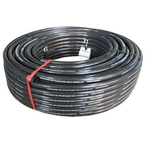 Descrição técnica: - material: polietileno; - medida: 3/4 - cor: preto - selo vermelho - uso ideal: transporte de fluídos - comprimento: 100 metros - espessura da parede: 1,80 mm - semi flexível suporta curvaturas - pode ficar exposta ao sol - também conhecida como mangueira de irrigação