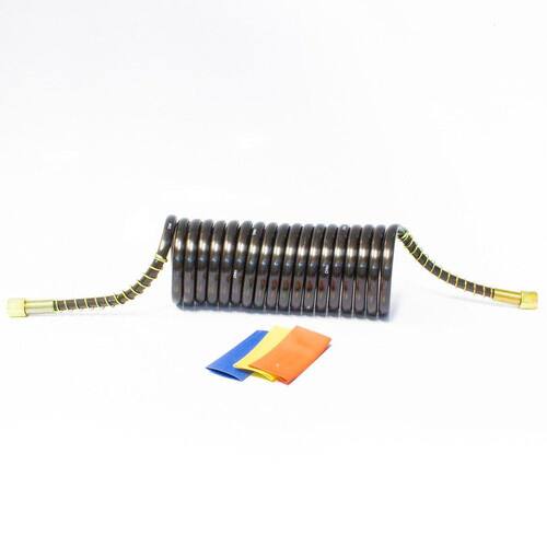 Mangueira Espiral para Freio a Ar 5,5 metros Acompanha 3 espaguetes termo-retráteis para identificação da mangueira: Diâmetro: 25mm e Comprimento: 100mm nas cores amarelo, azul, vermelho Com porca giratória 11/16 polegadas Sem Niple Diâmetro aproximado do tubo: 12mm ( Externo) e 9mm ( Interno) Material do tubo: PA6