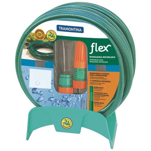 Mangueira flexível e de fácil manuseio. - Possui 15 metros de comprimento. - Recomendada para situações de uso com pressão da água de até 12 bar [174 psi] e temperatura de 50 C. - Para maior resistência possui 3 camadas distintas: interna em PVC, intermediária em fio de poliéster trançado e externa em PVC. - Acompanha 01 esguicho com jato regulável, 01 suporte fixo para mangueira e 01 adaptador com engate rosqueado. - O esguicho possui prático sistema de regulagem do fluxo d'água através do regulador frontal. - O esguicho é conectado em mangueiras através de sistema de fixação rosqueado Ean: 7891117056416