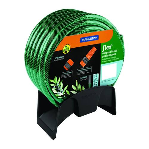 Leve cuidado e bem-estar para as tarefas do dia-a-dia com a mangueira flex Tramontina verde em PVC 3 camadas 20 m com engate rosqueado, esguicho e suporte mural. Ideal para a manutenção de hortas e jardins, ela possui engate rosqueado e esguicho com jato regulável. É uma mangueira de 20 metros de comprimento produzida em PVC verde, material que garante flexibilidade e resistência. Ela ainda vem com suporte manual, para armazenar e guardar seu produto com mais praticidade.