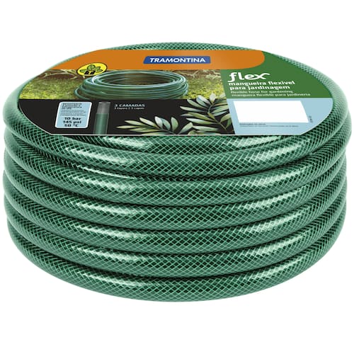 Para cuidar do seu jardim, você precisa de acessórios que sejam práticos e resistentes para desempenhar o trabalho com mais facilidade. A mangueira flex Tramontina verde em PVC 3 camadas 10 m é produzida com material de alta flexibilidade e revestida por três camadas, sendo que a camada em poliéster evita que a mangueira torça. Por ser flexível, o produto possibilitará atingir os pontos mais difíceis na hora de irrigar o seu jardim ou sua horta.
