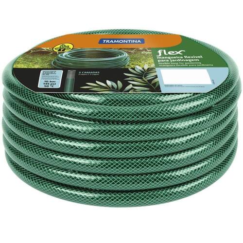 Características: - Mangueira flexível e de fácil manuseio. - Possui 15 metros de comprimento. - Recomendada para situações de uso com pressão da água de até 10 bar [145 psi] e temperatura de 50 C. - Para maior resistência possui 3 camadas distintas: interna em PVC, intermediária em fio de poliéster trançado e externa em PVC. - Peso: 1,89 kg