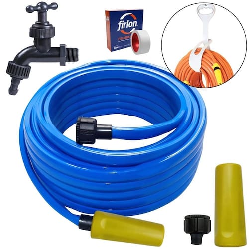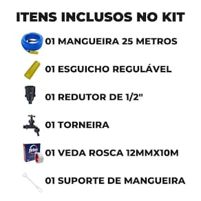 Mangueira de Jardim Reforçada Chata com 25 Metros Antitorção Perfeita para auxiliar nos cuidados ao ar livre, possibilitando alcançar os lugares mais difíceis na hora de lavar ou irrigar. Ela é eficiente e garante alta flexibilidade além de resistência, devido ao PVC presente em sua composição. Fabricada em PVC Flexível, com seu formato chato evita torção garantindo alta eficiência e flexibilidade além de resistência. É um produto que leva conforto e bem-estar para as tarefas do dia-a-dia. CARACTERÍSTICAS Mangueira de Jardim Flexível com Dupla Camada Leve e Prática para Enrolar Adaptável Para Torneiras de 1/2 e 3/4 Alta Flexibilidade Devido ao Silicone em sua Composição Maior Resistência Devido a sua Segunda Camada de Polipropileno Trançado ESPECIFICAÇÕES TÉCNICAS Diâmetro: 7/16 Espessura: 2,0mm Pressão Maxima: 20 bar ou 290 psi à 25ºC Pressão de Trabalho: 120 psi Temperatura de Trabalho: +5 à +50ºC Suporte Alça Plástica Portátil Cinza Para Mangueira A Alça Portátil para Mangueira Cinza é um acessório essencial para quem busca praticidade e organização na utilização de mangueiras. Com um design ergonômico e funcional, essa alça é projetada para facilitar o manuseio da mangueira, proporcionando um enrolamento fácil e evitando emaranhados indesejados. A versatilidade é uma das suas características principais, já que pode ser fixada na parede, otimizando o espaço e mantendo a área de trabalho ou jardim mais organizada. Essa alça é a escolha perfeita para quem busca um produto durável, garantindo praticidade no uso da mangueira. CARACTERÍSTICAS - Pode ser fixado na parede para armazenamento conveniente - Pegada anatômica para fácil manuseio - Resistente à corrosão e não enferruja ESPECIFICAÇÕES TÉCNICAS Material: Polietileno Tipo: Alça Portátil Medidas: 10,8 x 1,1 x 60cm Cor: Cinza do Fabricante: 90 dias Torneira Plástica em PVC Para Jardim Tanque Pia Com 1/2 Polegada A torneira para lavatório possui o volante anatômico, que facilita a abertura e o fechamento, o plástico ABS com proteção UV, e a durabilidade e a qualidade sempre presente nos produtos em nossos produtos. Fácil instalação, maior praticidade e durabilidade. ESPECIFICAÇÕES TÉCNICAS Largura: 10cm Altura: 13,5cm Diâmetro: 12,7cm 1/2 Material: Plástico PVC ITENS INCLUSOS 25M de Mangueira Flexível PVC 01 Engate de Torneira 1/2 e 3/4 01 Esguicho Regulável 01 Alça Para Mangueira 01 Torneira Plástica Reforçada 1/2 Marca: Não Informado