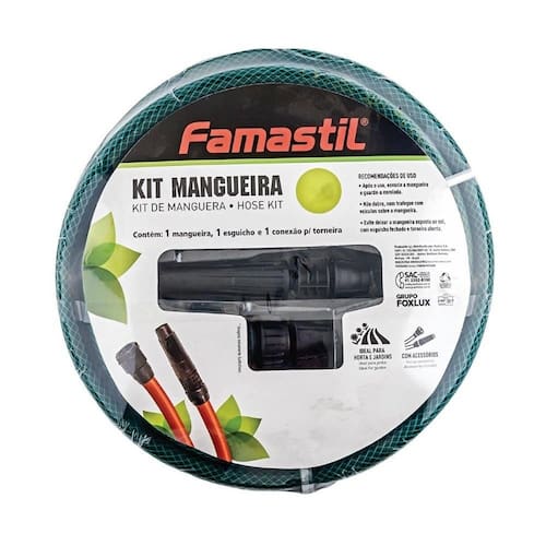 Recomendações de Uso: Após o uso, esvazie a mangueira e guarde-a enrolada. Não dobre, nem trafegue com veículos sobre a mangueira. Não deixar exposta ao sol, com esguicho fechado e torneira aberta.