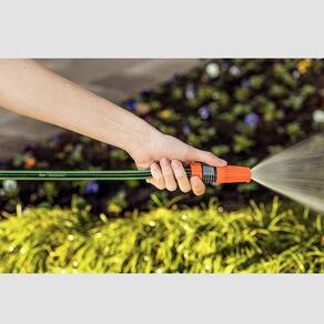 O esguicho possui prático sistema de regulagem do fluxo d'água através do regulador frontal, conectado em mangueiras através de sistema de fixação rosqueado.