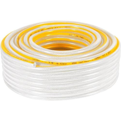 Ref.: do Fornecedor:3332380000Marca:VonderConteúdo da Embalagem:50 metros de mangueira cristal trançadaDestaques e diferenciais:Possui matéria-prima em PVC transparente.Aplicações e dicas de uso:Indicada condução de ar e água. Nunca utilizar para gás GLP.Características Técnicas:Diâmetro interno da mangueira: 3/8 - 9,5 mm Diâmetro externo da mangueira: 15,5 mm Cor da mangueira: Transparente Material da mangueira: PVC Pressão máxima de trabalho da mangueira PSI : 250 lbf/pol - 1,72 MPa. Comprimento da mangueira: 50,0 m Espessura da parede da mangueira: 3,00 mm Ean: 17893946620537