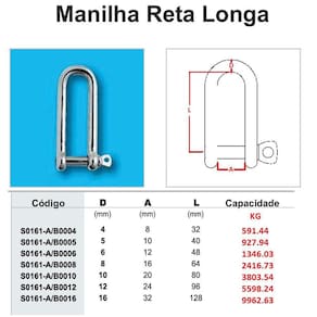 Manilha Inox Reta Longa 12Mm Com Pino Manilha reta multifuncional, utilizado para fixação de cabos, cordas e cabo de aço. Modelo utilizado para içamento de cargas, guinchos, como conector rápido. Informações adicionais: Material: inox 316 Modelo: universal Encaixe: fácil Itens inclusos: 1 manilha reta longa Marca: Não Informado