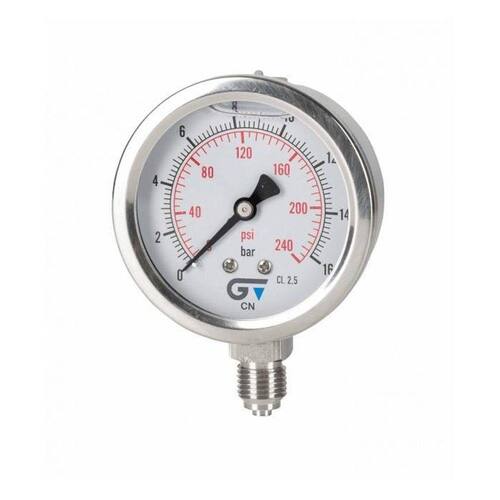 - manômetro dn63 - inox - glicerina - vertical - bsp - diâmetro 63 mm (2.1/2). - temperatura de trabalho de -15ºc a 55ºc. - rosca 1/4 macho bsp. Saída inferior (vertical). - caixa em aço inoxidável aisi 304. Com glicerina. - internos e conexão em latão une-en 12165. - visor em policarbonato. - dupla escala bar e psi. - asme b40.1-1991 b grade. - classe de precisão: cl.2,5