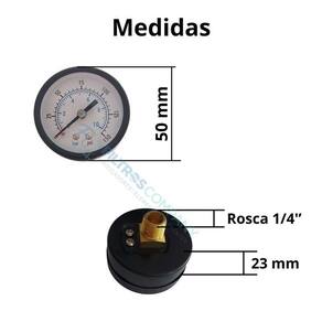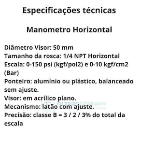 - dados técnicos: Forma de utilização: residencial e industrial; Diâmetro do visor: 50 mm. Escala de operação: 0-150 psi kgf/pol2 e 0-10 kgf/cm2 bar . Cor: preto Fluído: ar fixação rosca 1/4 - horizontal Ponteiro: alumínio ou plástico, balanceado sem ajuste. Visor: em acrílico plano. Mecanismo: latão com ajuste. Conexão: rosca 1/4 Precisão: classe b = 3 / 2 / 3% do total da escala Marca: purificare