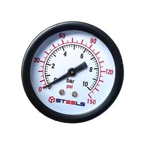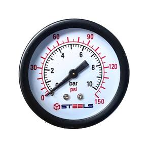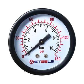 O Manômetro Steels é um instrumento confiável para medir a pressão do ar comprimido. Com uma caixa metálica de 40 mm e visor de acrílico, oferece durabilidade e clareza na leitura. Sua rosca NPT 1/8 permite fácil instalação, enquanto os materiais em latão garantem resistência. Com uma pressão máxima de 150 PSI / 10 BAR, é adequado para diversas aplicações com ar e água e usos em reguladores de pressão de ar.