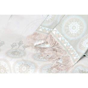 Fabricado em tecido jacquard rústico dupla face, em tons de verde chá e palha, com desenhos em flores detalhes em franjas em duas laterais.
