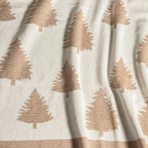 A Manta Decor Golden Baviera tem 110 x 150 cm e é produzida em 90% algodão e 10% fio metálico dourado, com padronagem de árvore de Natal para complementar a decoração da sala e criar deliciosas e confortáveis texturas para sofá e poltronas.