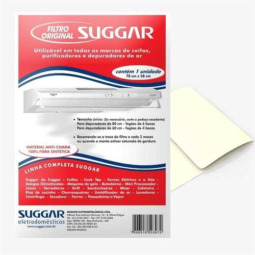 - Pacote com 1 manta filtrante autêntico Suggar - Utilizável em todas as marcas de coifas, purificadores e depuradores de ar - Material Anti-chamas 100% Fibra Sintética - Tamanho único (se necessário, corte o pedaço excedente) - Para depuradores de 80 cm - fogões de 6 bocas - Para depuradores de 60 cm - fogões de 4 bocas - Recomenda-se a troca do filtro a cada 2 meses ou quando a manta estiver saturada de gordura - Recomenda-se verificar o manual de seu produto, para certificar-se do tipo de manta utilizada
