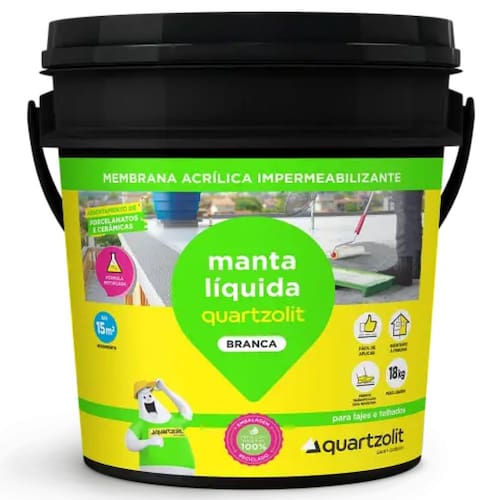 Manta Líquida Membrana Acrílica Impermeabilizante Branca 18 Kilos - 31113.02.34.053 - QUARTZOLIT Descrição: A manta líquida branca quartzolit é um impermeabilizante à base de resina acrílica, aplicado a frio, com elevada durabilidade indicado para lajes e coberturas com ou semtrânsito, e pode também, ser aplicado em telhas de fibra ou de fibrocimento. Além deevitar infiltrações, resiste bem às intempéries, retendo pouca fuligem e quando curadoforma uma membrana flexível, impermeável de alta resistência. A cor da manta liquidabranca quartzolit é resistente e ajuda a reduzir o calor interno do ambiente. Alémdisso, o produto pode ficar exposto ou receber assentamento de cerâmica ouporcelanato, permitindo neste caso, o trânsito de pessoas. Indicações:Para coberturas sem trânsito, como lajes de concreto armado; Telhas de fibrocimento; Telhas cerâmicas; Lajes com trânsito, desde que revestidas; Proteção superficial de estruturas de concreto armado. 2PRINCIPAIS VANTAGENS Acomoda pequenas movimentações da estrutura presentes no substrato; Mantém as propriedades em baixas temperaturas; Forma barreira aos agentes contaminantes provenientes da atmosfera; Baixa retenção de fuligem; Resistência a raios ultravioletas e a intempéries; Baixa absorção de água em longos períodos; Fácil aplicação; Pode ser pigmentado (vide seção de aplicação). Composição:Copolímero acrílico, cargas minerais e aditivos selecionados Massa Específica:1,216 kg / dm³ pH: 8,5 a 9,5 Características do Produto:Aspecto da Película: FoscoCor: BrancoDemãos: Mínimo 3 demãos Condições de Trabalho: Verifique a temperatura de trabalho: Temperatura ambiente entre 5 °C e 40 °C. Temperatura da base entre 5 °C e 40 °C Consumo Teórico Aproximado: Consumo mínimo de 1,2 kg/m² para se aplicar em no mínimo 3 demãos, com intervalo mínimo de 2 horas entre demãos. Para áreas onde o produto será revestido com cerâmica ou porcelanato, o consumo é de 1,8 kg/m² em até 5 demãos. Tempo de Secagem: Período mínimo entre demãos: 2 horas Tempo de secagem ao toque: 2 horas Secagem total: 24 horas Aplicação de revestimento: após 7 dias da aplicação Normas Técnicas:ABNT NBR 13321 (Classe C), ABNT NBR 9574, ABNT NBR 9575 *imagens meramente ilustrativas.