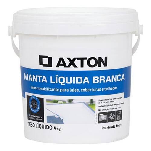 Apresentamos a Manta Liquida Impermeabilizante Axton, na cor branca, com 4 kg de peso. Este e um produto de alto rendimento, capaz de cobrir ate 4,00 m2 por embalagem, com uma aplicacao de 1 a 1,2kg por metro quadrado. O acabamento liso proporciona uma textura agradavel e uma aparencia ao seu projeto de impermeabilizacao. A Manta Liquida Axton e indicada para uso em lajes, coberturas, areas molhadas, telhas de concreto e fibrocimento. Sua formula de alta qualidade e projetada para oferecer uma protecao duradoura contra a umidade e a infiltracao de agua. Ela cria uma barreira impermeabilizante que protege a estrutura do edificio, prolongando sua vida util e mantendo a integridade do material. Este produto e facil de aplicar e oferece um acabamento branco brilhante que realca a beleza de qualquer superficie. E uma opcao pratica e eficiente para suas necessidades de impermeabilizacao. Para mais informacoes sobre a aplicacao e os cuidados necessarios, basta dar um zoom na foto do produto e conferir as instrucoes na embalagem. Resumo das caracteristicas e especificacoes: - Produto: Manta Liquida Impermeabilizante - Uso indicado: Lajes, coberturas, areas molhadas, telhas de concreto e fibrocimento - Tipo de impermeabilizante: Manta Liquida - Rendimento: 4,00 m2 - Informacoes do rendimento: 1 a 1,2kg/m2 - Marca: Axton - Peso do produto: 4,00 Kg - Cor: Branco - Acabamento: Liso Marca: Não Informado Ean: 7894422005384