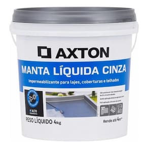Resumo das caracteristicas e especificacoes: Manta Liquida Impermeabilizante com peso de 4 kg, cor cinza, acabamento liso e tempo de secagem de 4 horas. Rendimento de 1,20 m2 por kg, sendo recomendada a aplicacao de 3 demaos para uma cobertura completa. Produto indicado para uso em lajes, coberturas, areas molhadas, telhas de concreto e fibrocimento. Altura de 19 cm e largura de 18 cm. Produto da marca Axton.