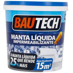 Descrição: Apresentamos a Manta Líquida Impermeabilizante Acrílica Bautech, a solução prática, eficiente e de alta cobertura para proteger sua construção contra infiltrações. Este produto é uma emulsão acrílica pronta para uso, formulada com polímeros de última geração que formam uma película contínua, flexível e altamente aderente. Sua cor branca ajuda na reflexão do calor e proporciona um acabamento liso e uniforme. A embalagem contém 15kg do produto, com um rendimento médio de 15m² por demão (sendo necessárias 2 demãos para a formação da manta). A aplicação é simples, podendo ser realizada com rolo, trincha ou equipamento airless, e seca rapidamente, permitindo a execução de ambas as demãos no mesmo dia.