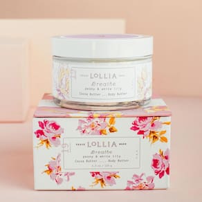 LOLLIA Breathe Body Butter, 156 g - Fragrância de peônia e lírio branco - manteiga de karité e manteiga de cacau, loção corporal para mulheres, hidratante corporal suave e hidratante - Hidratante corporal floral: a manteiga corporal Lollia Breathe é ultra nutritiva e ricamente reconfortante. Delicadas infusões florais de peônia, lírio branco, toranja fresca e laranja deixam a pele deliciosamente perfumada. - Creme corporal hidratante: esta loção corporal para mulheres é infundida com manteiga de karité, óleo de abacate, folha de aloe e manteiga de cacau para hidratação exuberante que é ultra-nutritiva e para restaurar o brilho. - Design de embalagem elegante: uma elegante caixa com tampa de rosas de repolho vintage e peônias flutuantes modernas contém um belo recipiente de vidro cheio de loção de manteiga de cacau rica em umidade. - Suave e simples de usar: pegue um pouco de manteiga corporal e alise na pele. Formulado para absorver rapidamente. Pode ser utilizado quantas vezes for necessário. Esta loção de manteiga de karité hidrata enquanto faz uma declaração de sofisticação moderna. - Tornando a beleza mais bonita: Margot Elena passou mais de 20 anos desenvolvendo carinhosamente mundos de marcas para uma escapada agradável e diária. De embalagens complexas a fórmulas luxuosas e fragrâncias requintadas, cada elemento é cuidadosamente trabalhado.