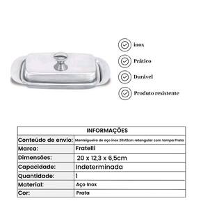 A Manteigueira de aço inox 20x12cm retangular com tampa Prata, possui um design elegante para decorar a sua mesa de café da manhã/tarde, ela é super prática para o dia a dia, além de manter a manteiga bem conservada. A tampa protege os produtos da umidade, ressecamento e contaminação, mantendo o produto fresco por mais tempo. Fabricado em aço inox durável e resistente. Informações importantes; Medidas aproximadas da manteigueira - 20 x 12,3 x 6,5cm Comprimento x largura x altura Medidas da base - 20 x 12,3 x 4cm Comprimento x largura Medidas da tampa - 13,8 x 10,6 x 3cm Diâmetro x altura Composição - Aço Inox Cor - Prata Validade - Indeterminada Conteúdo do envio - 1 unidade da Manteigueira de aço inox 20x12cm retangular com tampa Prata Mais Informações; Use somente esponja macia e sabão neutro. Não limpe as peças com esponja ásperas, palha de aço ou produtos abrasivos. Enxágue com água em abundância. Para secar, utilize um pano seco e macio. Manteigueira de aço inox 20x12cm retangular com tampa Prata Ean: 7899110592276