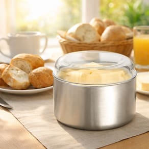 Sua base é fabricada em aço inox de alta qualidade, garantindo que o produto não enferruje e mantenha o brilho por muito mais tempo. A tampa em acrílico transparente permite a visualização rápida do conteúdo sem a necessidade de abertura, ajudando a manter a temperatura e a textura ideal da manteiga ou margarina por mais tempo.