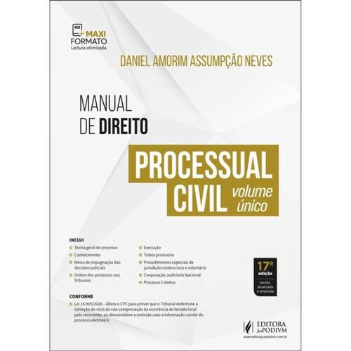 CONFORME: • Lei 14.939/2024: Altera o CPC para prever que o Tribunal determine a correção do vício de não comprovação da ocorrência de feriado local pelo recorrente, ou desconsidere a omissão caso a informação conste do processo eletrônico. CONTÉM: • Teoria geral do processo • Conhecimento • Meios de impugnação das decisões judiciais • Ordem dos processos nos Tribunais • Execução • Tutela provisória • Procedimentos especiais de jurisdição contenciosa e voluntária • Cooperação Judiciária Nacional • Processo Coletivo POR QUE ESCOLHER O LIVRO “MANUAL DE DIREITO PROCESSUAL CIVIL - VOLUME ÚNICO”? Nesta 17ª edição, além das atualizações jurisprudenciais de praxe e de alterações pontuais de conteúdo, que também costumam ocorrer, o que mudou de mais significativo com relação à edição passada foram os capítulos referentes à Teoria Geral dos Recursos. A razão desta mudança foi o lançamento, no segundo semestre de 2023, do meu mais recente livro, Teoria Geral dos Recursos. Fruto de uma extensa pesquisa jurisprudencial e doutrinária, a obra me lançou a um grande desafio: reescrever os capítulos referentes ao tema no Manual de Direito Processual Civil sem perder a característica de um manual, ou seja, mantendo a objetividade e sem aumentar o tamanho do livro. Confesso que não foi uma tarefa fácil, mas acredito que o trabalho tenha ficado bom. Os capítulos foram praticamente reescritos, estando absolutamente atualizados. Reflexamente também houve mudanças em alguns recursos em espécie, ainda que nesses de maneira menos significativa. Espero que o resultado agrade aos leitores. Marca: JUSPODIVM *
