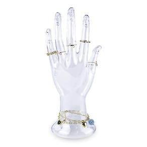 A mão expositora para joias é um suporte sofisticado e funcional, ideal para destacar anéis, pulseiras e braceletes de maneira elegante e organizada. Fabricada em acrílico transparente de alta qualidade que garante resistência e um visual moderno. Com design anatômico, ela tem um formato de mão estilizado para acomodar as joias de forma natural e atraente. Por ser transparente, realça as peças sem interferir na sua aparência. Sua base é estável, evitando quedas. Perfeito para vitrines de joalherias, lojas de bijuterias ou até mesmo organização pessoal. Uma peça ideal para quem deseja exibir suas joias com sofisticação e minimalismo.